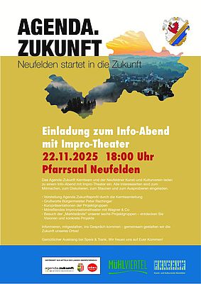 Das Agenda-Zukunft Kernteam und der Neufeldner Kunst- und Kulturverein laden zu einem Info-Abend mit Impro-Theater ein. Alle Interessierten sind zum Mitmachen, zum Diskutieren, zum Staunen und zum Ausprobieren eingeladen.